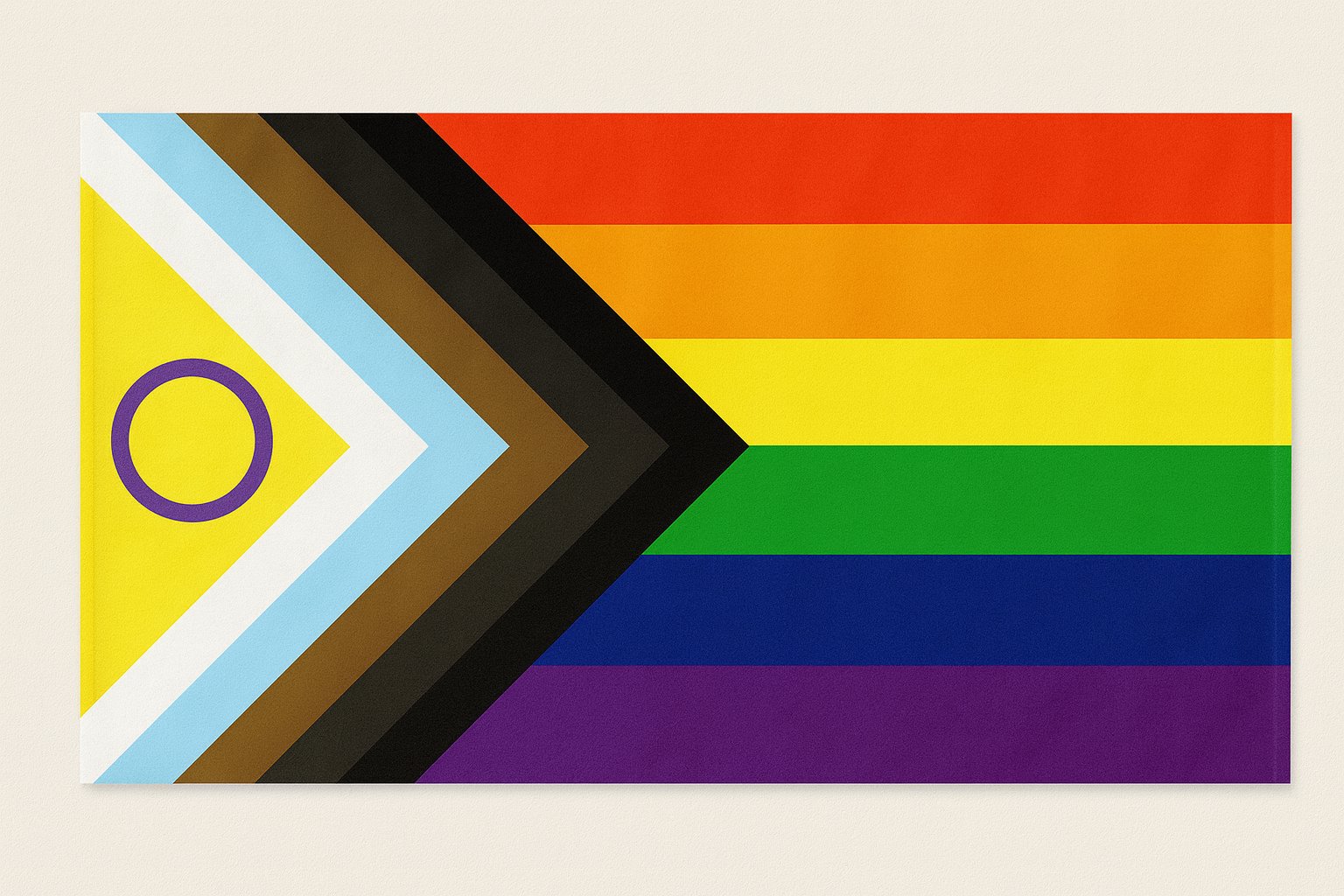Den moderna Pride-flaggan som står för inkludering och mångfald. Tillverkad i slitstark polyester med klara färger. Flaggan har en kanal för pinne, vilket gör den enkel att vifta med vid Pride-parader, demonstrationer och event.