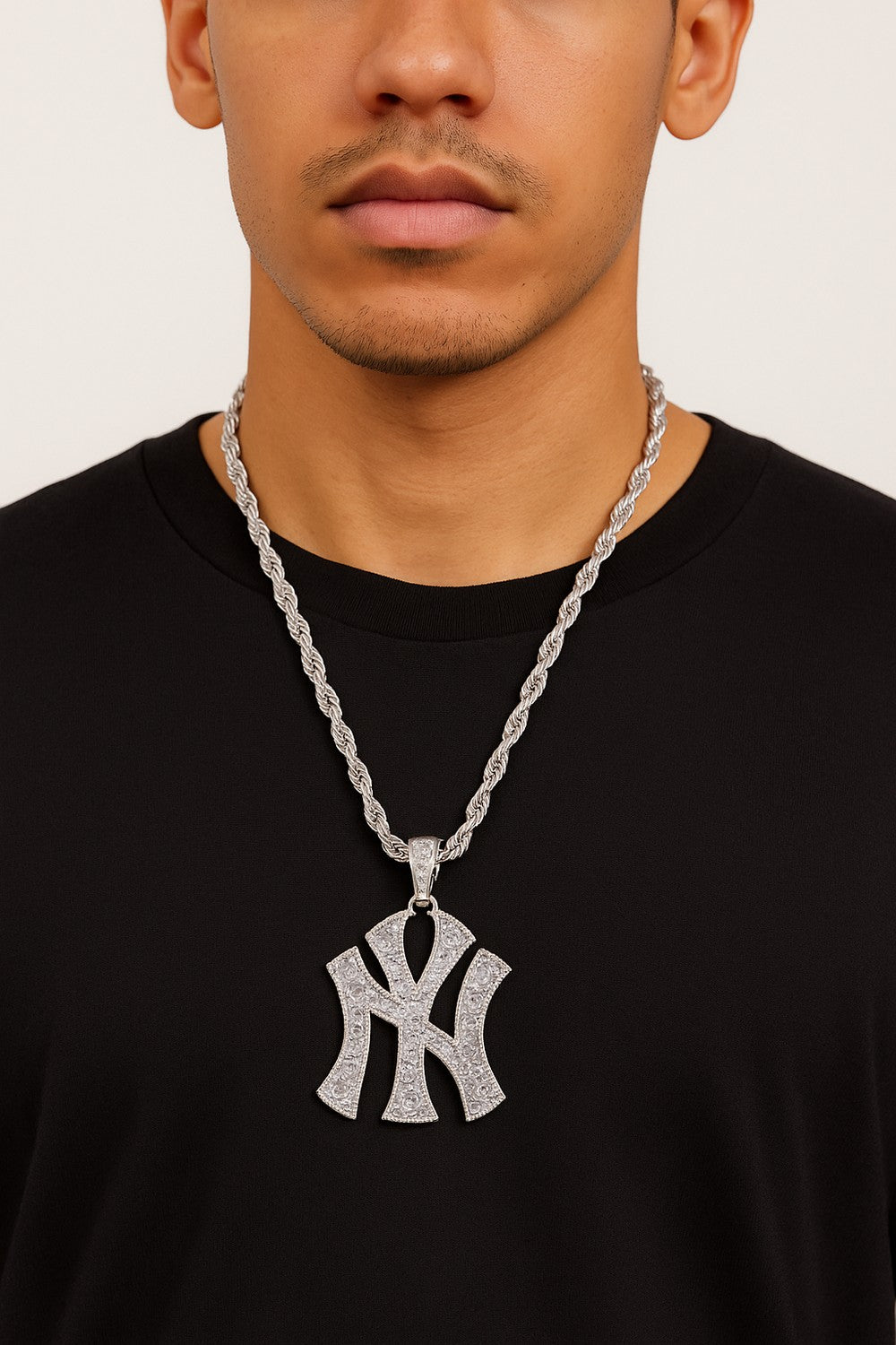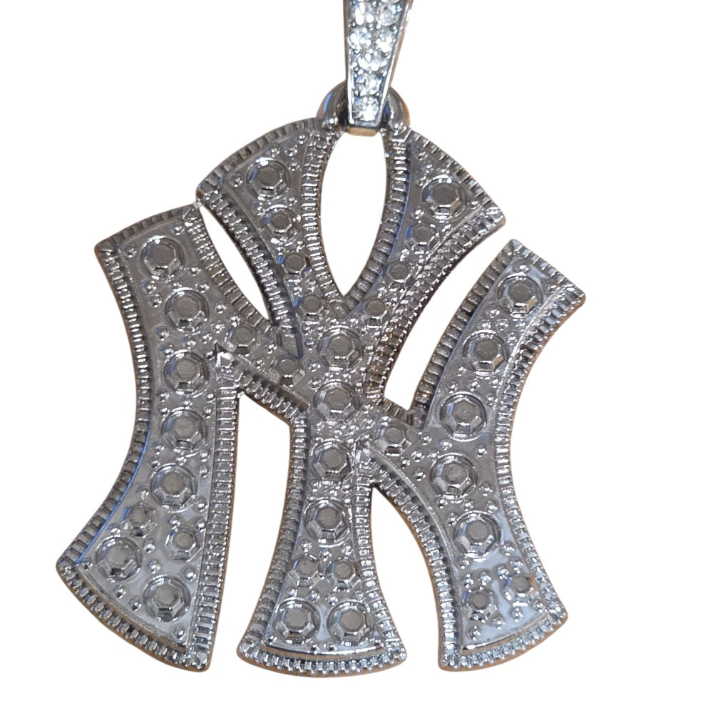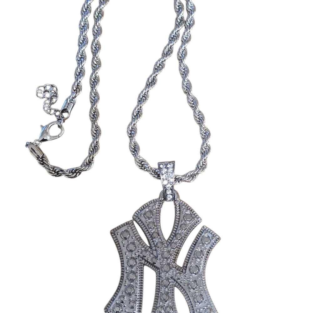Snyggt och trendigt silverfärgat halsband med ett stort hänge i form av bokstäverna NY, dekorerat med glittrande stenar. Hänget är ca 5 cm brett och 7 cm långt, vilket gör det till en riktigt iögonfallande accessoar. Kedjan är ca 55 cm lång och har en vriden design som förstärker den lyxiga känslan. Perfekt för dig som vill ha en urban, street- och hiphopinspirerad look.