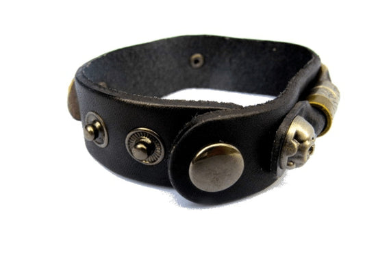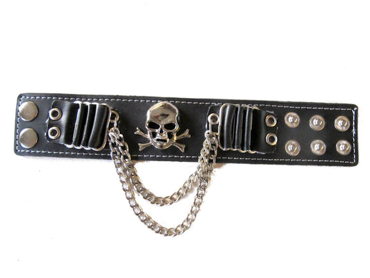 AlennusmyyntiMusta nahkaranneke, jossa pääkallo ja ketjut