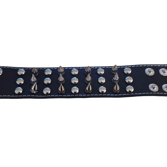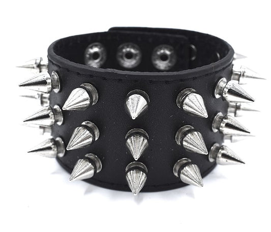 Bred nitarmband i svart läder med tre rader koniska spikes