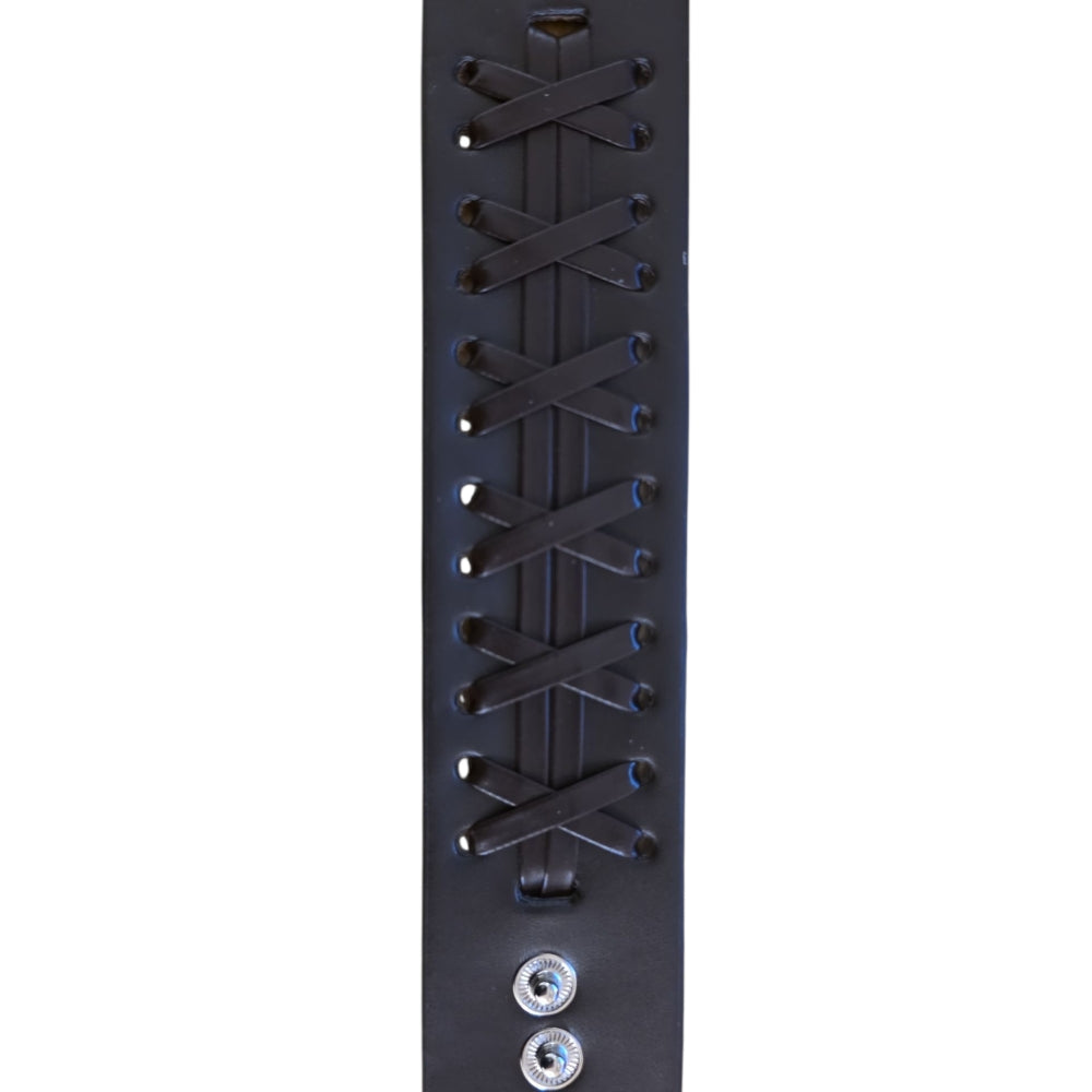 Klassiskt och stilrent brett armband i svart konstläder med dekorativ korssnörning. Den tidlösa designen passar både rockig och vardaglig stil, och den justerbara passformen med tryckknappar gör det enkelt att bära bekvämt. Perfekt för konserter, festivaler eller som en snygg accessoar till din outfit.