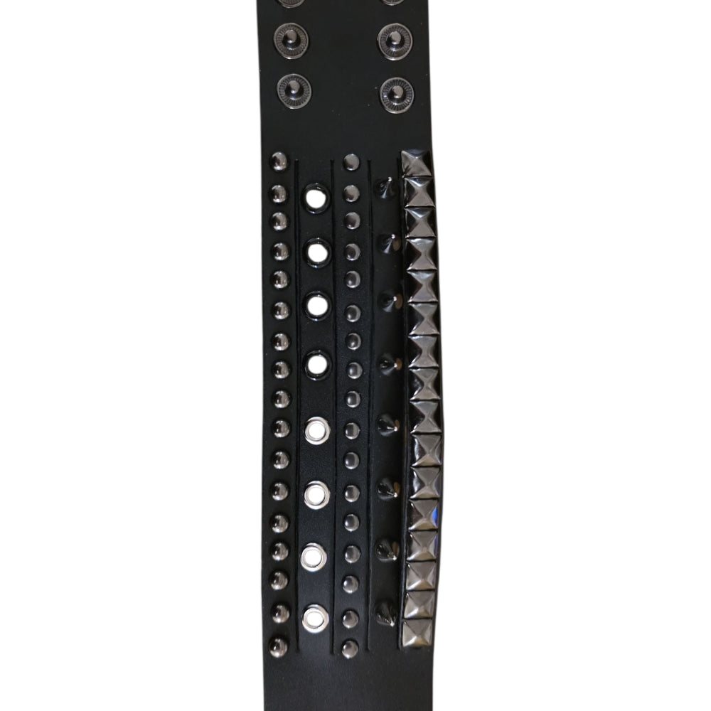 Gör ett kraftfullt stilstatement med detta svarta läderarmband som kombinerar flera olika nitdesigner i ett unikt och iögonfallande mönster. Armbandet har en rad svarta pyramider, silverfärgade spikar, runda nitar och dekorativa hål som ger en edgy och rockig look. Perfekt för konserter, festivaler, klubbkvällar eller som en cool vardagsaccessoar. Tillverkat i slitstarkt konstläder med tryckknappar för enkel på- och avtagning.