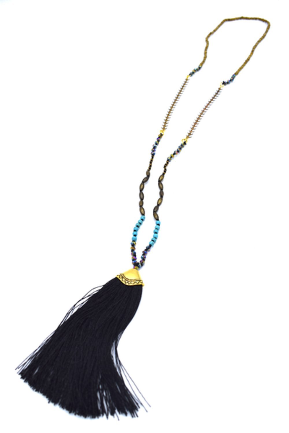 Långt halsband med flera olika färgglada pärlor och ett snyggt hänge med fransar.