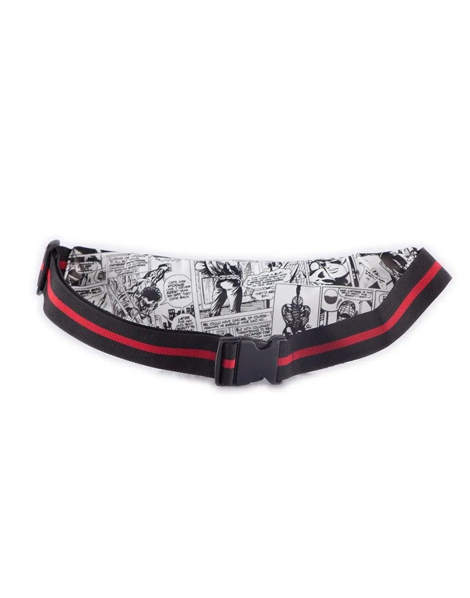 Bär din nostalgi med denna midjeväska med all-over-tryck gjord av svart solid polyester, justerbara svarta och röda remmar, MARVEL-design, dragkedja med sladd och matt skärmtryckt framficka.
