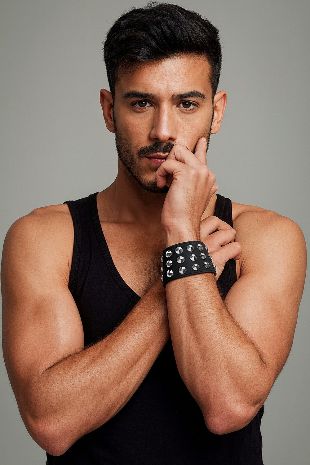 Detta breda nitarmband i konstläder är prytt med tre rader robusta pyramidformade metallnitar, vilket ger ett kraftfullt och stilrent uttryck. Ett måste för dig som gillar punk, rock eller bikerstil. Armbandet stängs med tryckknappar som gör det enkelt att justera storleken för perfekt passform.