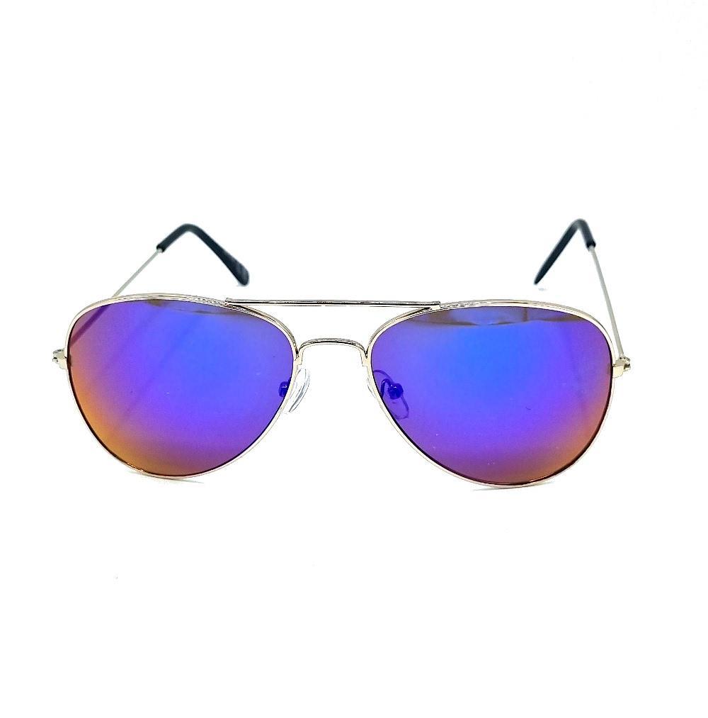 En klassisk vinklad, ovalformad båge med böjda kanter och en stor lins. Bågarna är av nickelfritt stål och färgade i silver med en blå/lila lins.Var både trendig och skydda dina ögon samtidigt med dessa solglasögon. Denna modell är UV400-säkrad vilket innebär att den skyddar mot UV-ljus.