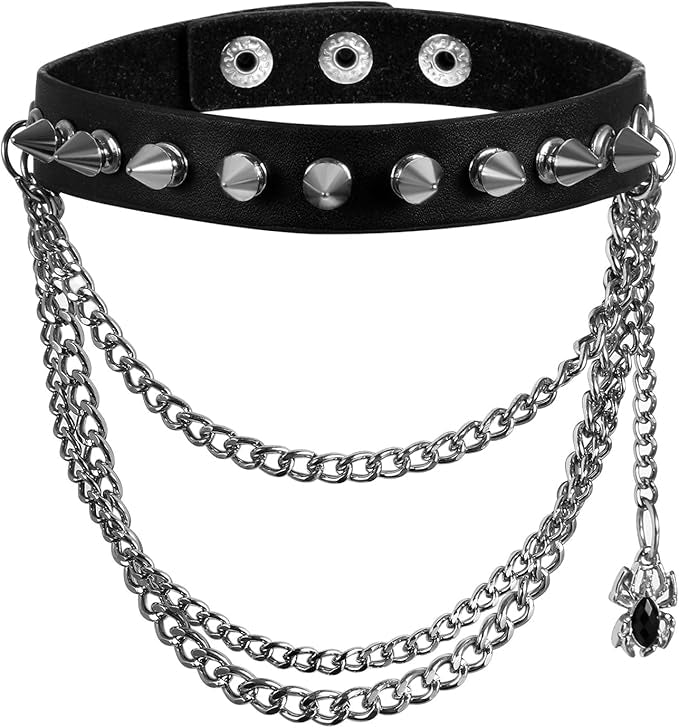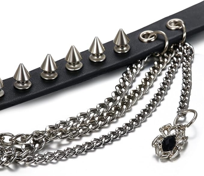 Denna svarta choker i läderlook är dekorerad med silverfärgade nitar, hängande kedjor och en unik spindelberlock. Ett perfekt smycke för dig som vill addera en rockig, goth- eller punkinspirerad stil till din outfit.